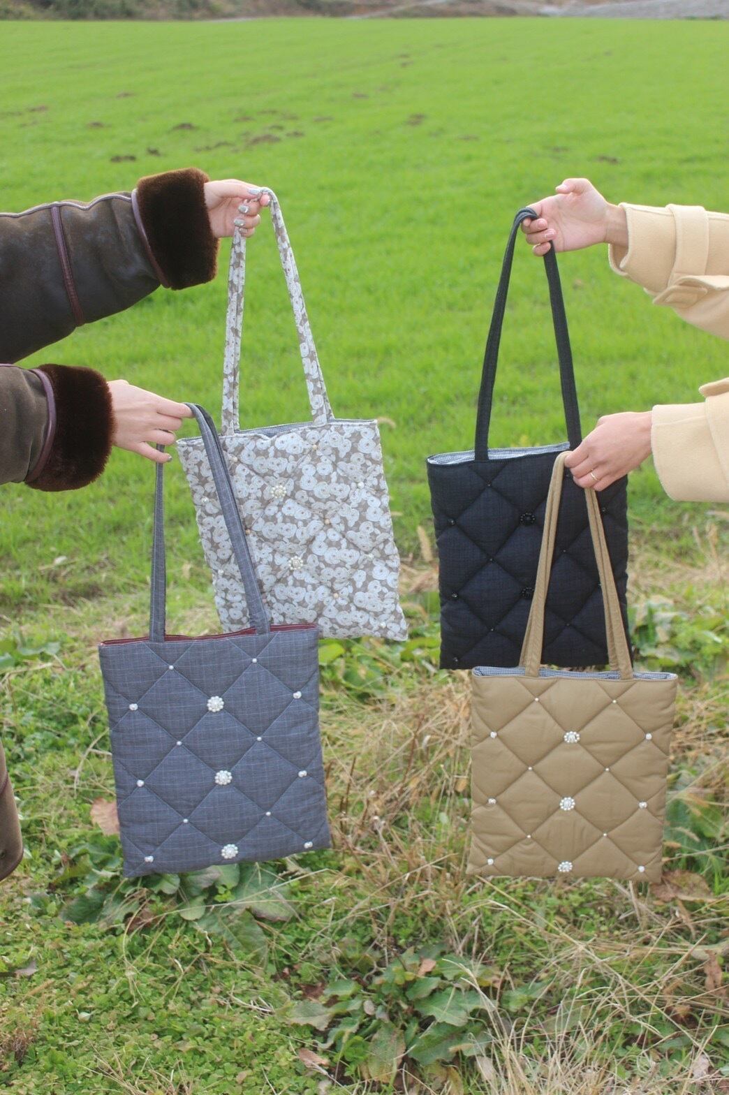 ふかふかのクッションのようなトートを作りたいと思い、キルト芯にさらに綿をはさんで、ふっかふかに仕上げました。